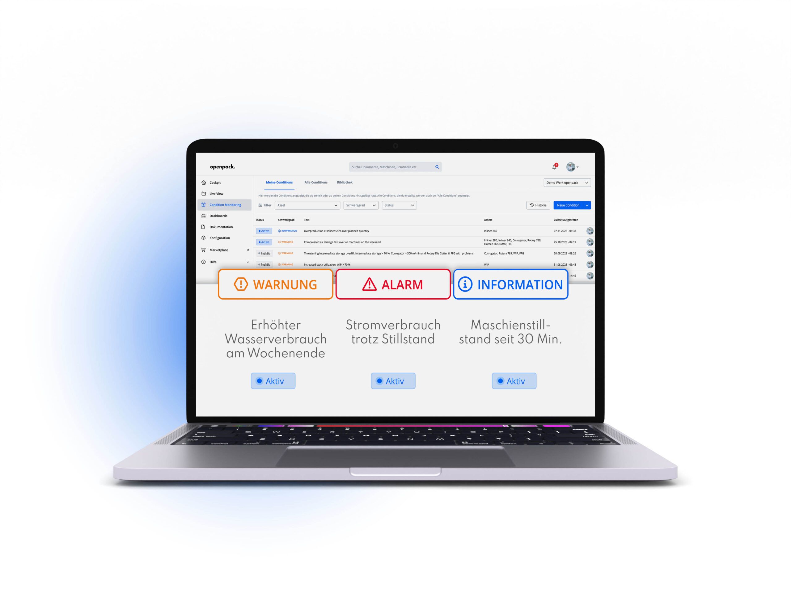 Unser Condition Monitoring ermöglicht es, dich und deine Kollegen bei Problemen in der Produktion sofort zu benachrichtigen. So kannst du schnell reagieren und deine Produktivität optimieren! Du kannst die Funktion perfekt auf deine Bedürfnisse zuschneiden und deine Anwendungsfälle selbst festlegen. Deine Alarme kannst du außerdem mit deinen registrierten Kollegen teilen und sie auf dem Laufenden halten.